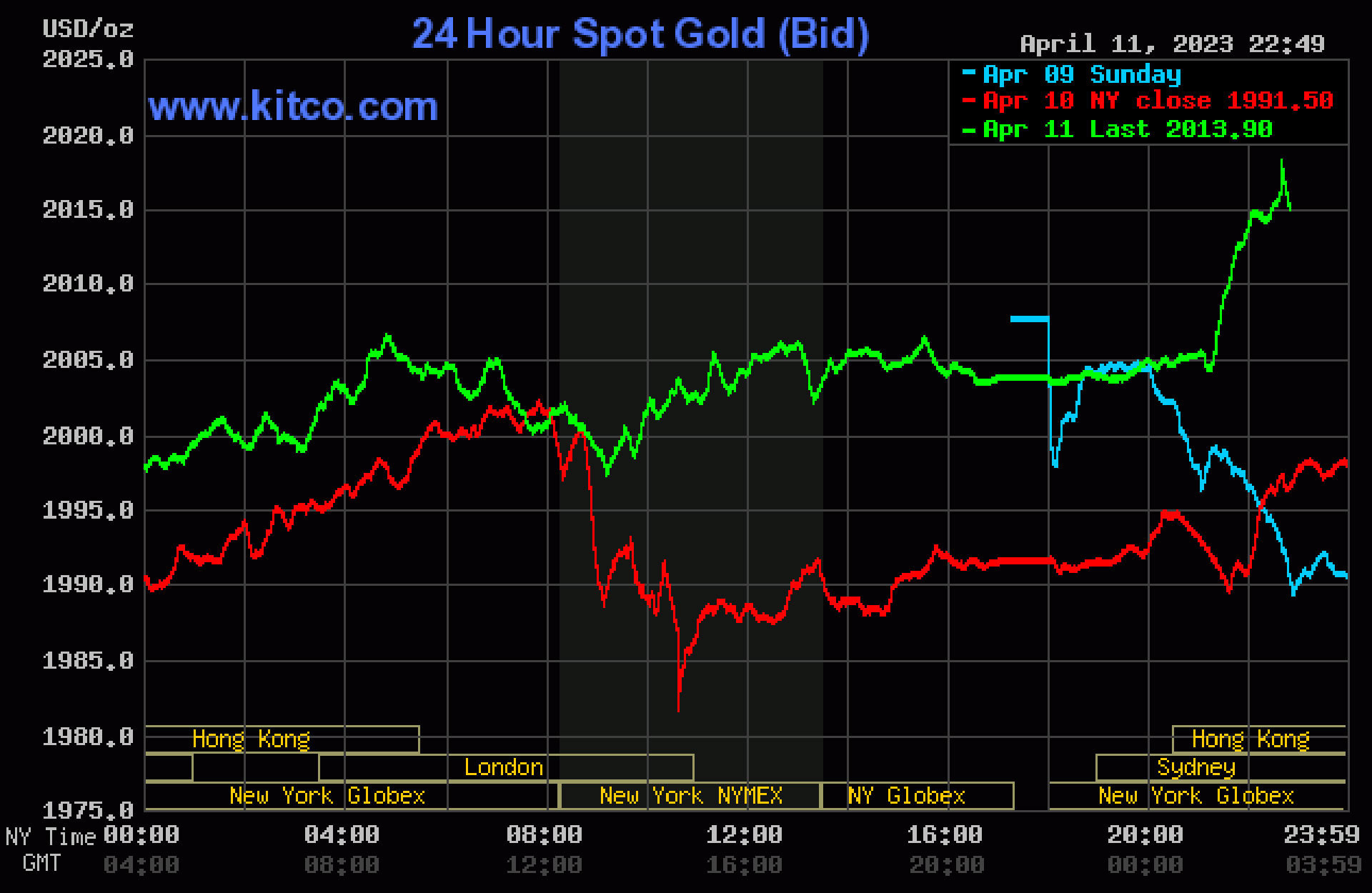 Đêm 11/4 (giờ Việt Nam), giá vàng thế giới giao ngay đứng quanh ngưỡng 1.998 USD/ounce. Vàng giao tháng 6 trên sàn Comex New York ở mức 2.003 USD/ounce.