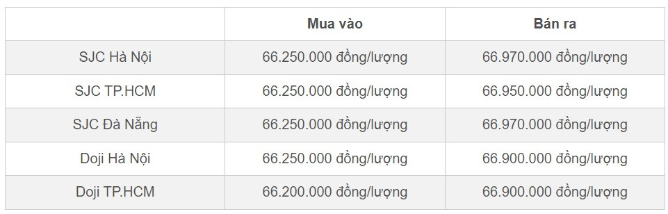 Doji Hà Nội niêm yết ở mức 65,95 triệu đồng/lượng (mua vào) và 66,75 triệu đồng/lượng (bán ra). Doji TP.HCM mua vàng SJC ở mức 66 triệu đồng/lượng, bán ra ở mức 66,8 triệu đồng/lượng.