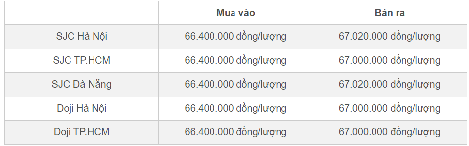 Doji Hà Nội: 66.400.000 đồng/lượng - 67.000.000 đồng/lượng