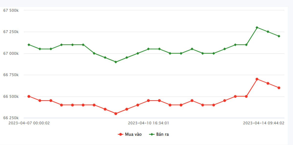 Chốt phiên giao dịch 13/4, giá vàng miếng 9999 tại SJC TP.HCM là 66,5 triệu đồng/lượng (mua vào) và 67,1 triệu đồng/lượng (bán ra). SJC Hà Nội niêm yết ở mức 66,5 triệu đồng/lượng (mua vào) và 67,12 triệu đồng/lượng (bán ra).