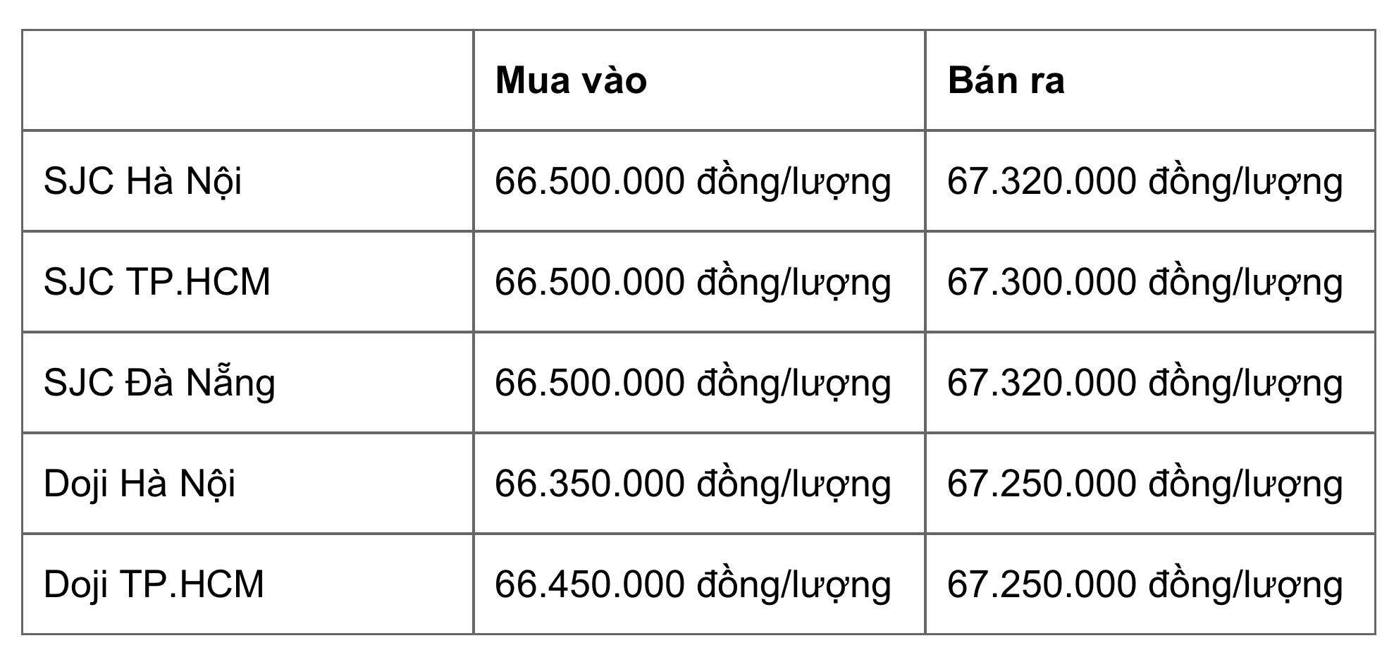 Doji Hà Nội: 66,35 triệu đồng/lượng - 67,25 triệu đồng/lượng