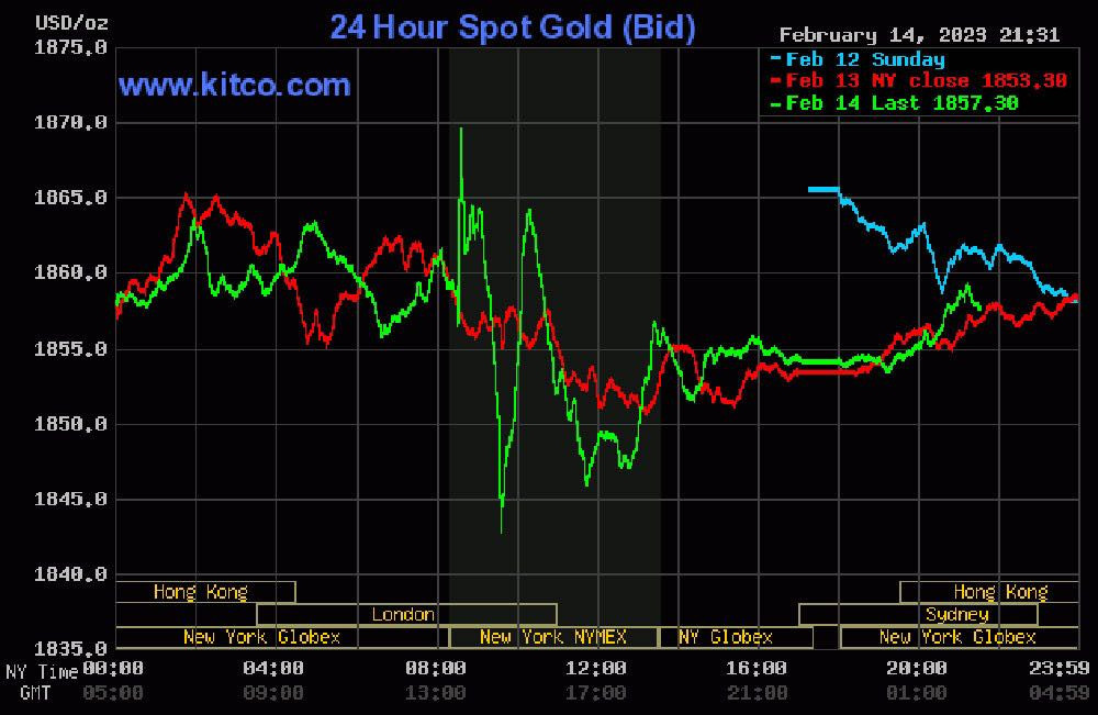 Đêm 14/2 (giờ Việt Nam), giá vàng thế giới giao ngay đứng quanh ngưỡng 1.855 USD/ounce. Vàng giao tháng 4 trên sàn Comex New York ở mức 1.867 USD/ounce.