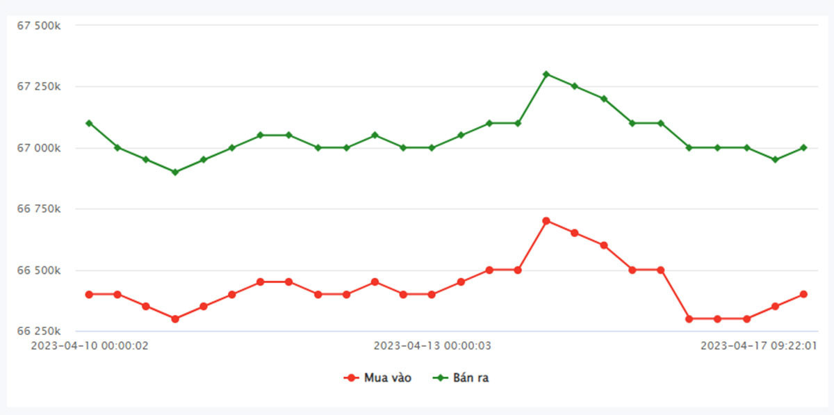 Chốt phiên giao dịch 15/4, giá vàng miếng 9999 tại SJC TP.HCM là 66,3 triệu đồng/lượng (mua vào) và 67 triệu đồng/lượng (bán ra). SJC Hà Nội niêm yết ở mức 66,3 triệu đồng/lượng (mua vào) và 67,02 triệu đồng/lượng (bán ra).