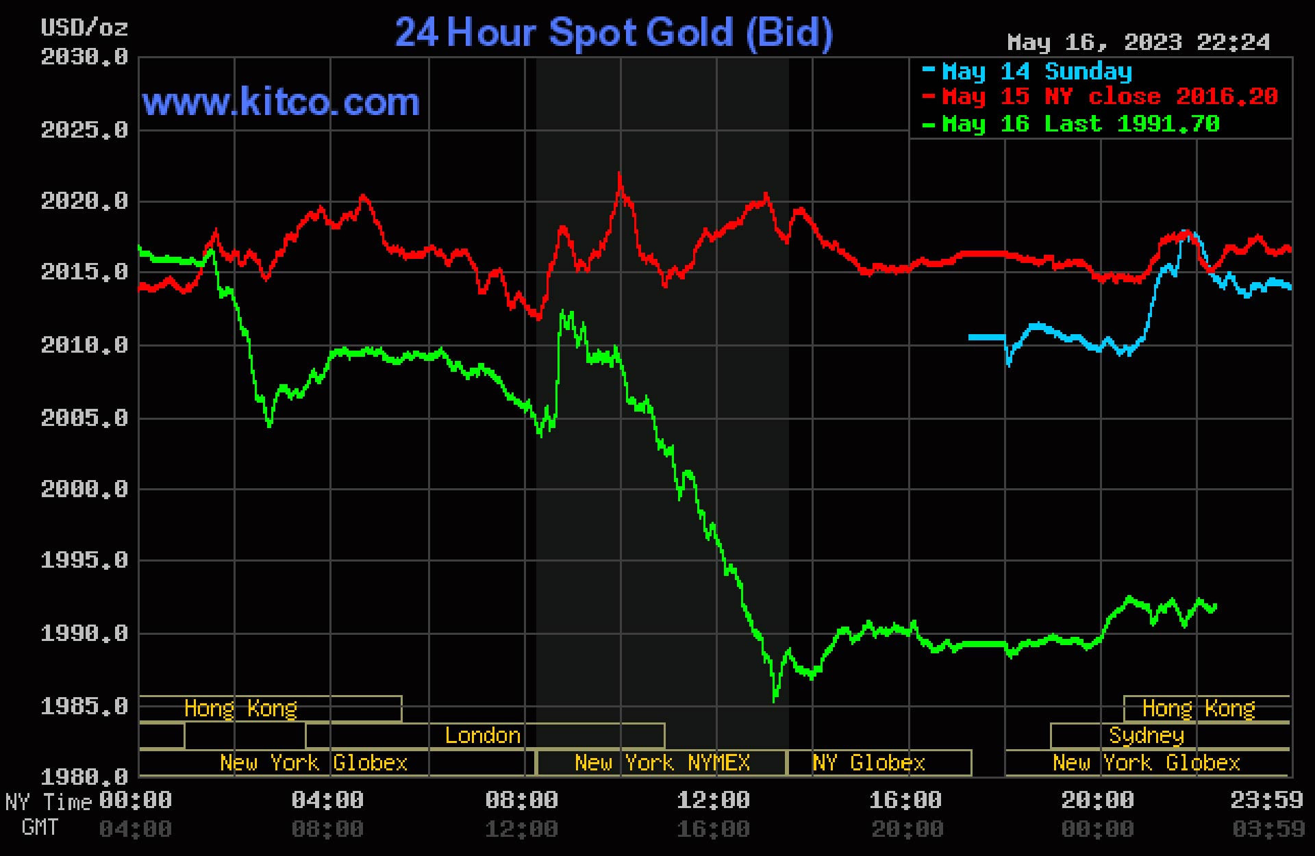 Đêm 16/5 (giờ Việt Nam), giá vàng thế giới giao ngay có lúc xuống ngưỡng 2.006 USD/ounce. Vàng giao tháng 6 trên sàn Comex New York ở mức 2.008 USD/ounce.
