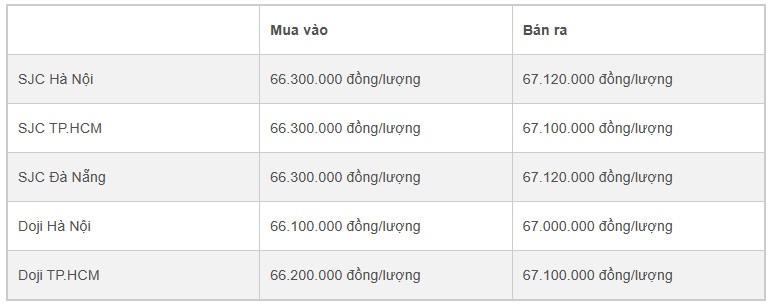 Doji Hà Nội niêm yết ở mức 66,1 triệu đồng/lượng (mua vào) và 67 triệu đồng/lượng (bán ra). Doji TP.HCM mua vàng SJC ở mức 66,2 triệu đồng/lượng, bán ra ở mức 67 triệu đồng/lượng.