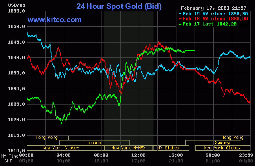 Tới 9h51' hôm nay (ngày 18/2, giờ Việt Nam), giá vàng thế giới giao ngay đứng quanh ngưỡng 1.842,2 USD/ounce, tăng 16,2 USD/ounce so với đêm qua. Giá vàng giao tương lai tháng 4 trên sàn Comex New York ở mức 1.850,2 USD/ounce, tăng 23,2 USD/ounce so với đêm qua.