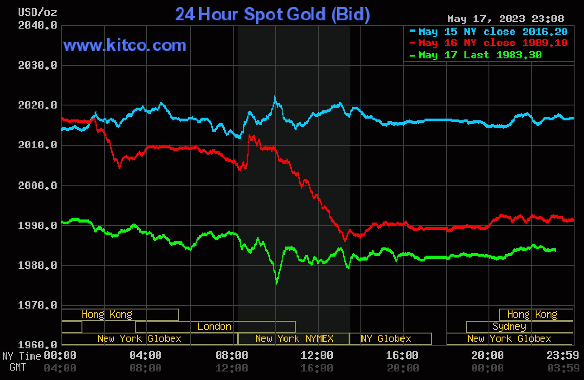 Đêm 17/5 (giờ Việt Nam), giá vàng thế giới giao ngay có lúc xuống ngưỡng 1.979 USD/ounce. Vàng giao tháng 6 trên sàn Comex New York ở mức 1.982 USD/ounce.