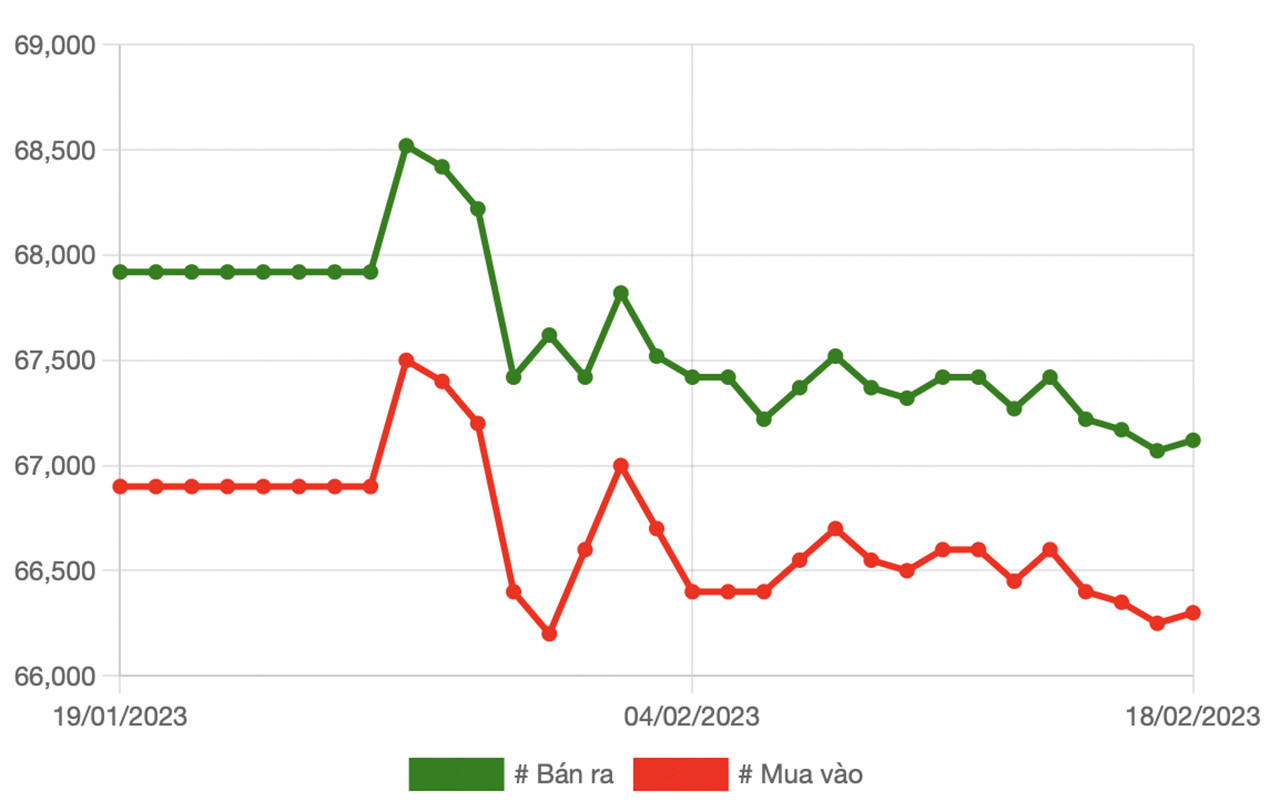Chốt phiên giao dịch 18/2, giá vàng miếng 9999 tại SJC TP.HCM là 66,3 triệu đồng/lượng (mua vào) - 67,1 triệu đồng/lượng (bán ra). SJC Hà Nội niêm yết ở mức 66,3 triệu đồng/lượng (mua vào) và 67,12 triệu đồng/lượng (bán ra).