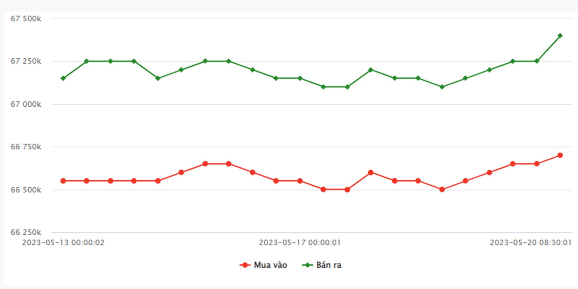 Chốt phiên giao dịch 19/5, giá vàng miếng 9999 tại SJC TP.HCM là 66,65 triệu đồng/lượng (mua vào) và 67,25 triệu đồng/lượng (bán ra). SJC Hà Nội niêm yết ở mức 66,65 triệu đồng/lượng (mua vào) và 67,27 triệu đồng/lượng (bán ra).