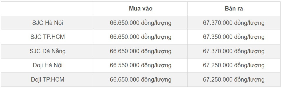 Doji Hà Nội: 66.45.000 đồng/lượng - 67.150.000 đồng/lượng