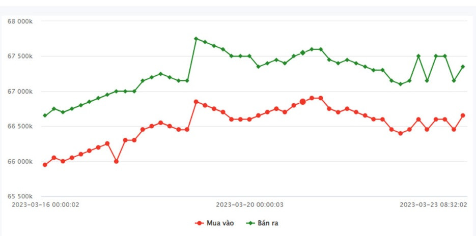 SJC Hà Nội: 66.450.000 đồng/lượng - 67.170.000 đồng/lượng