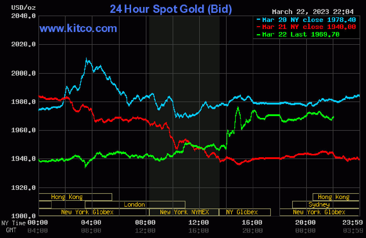 Đêm 22/3 (giờ Việt Nam), giá vàng thế giới giao ngay đứng quanh ngưỡng 1.943 USD/ounce. Vàng giao tháng 4 trên sàn Comex New York ở mức 1.946 USD/ounce.