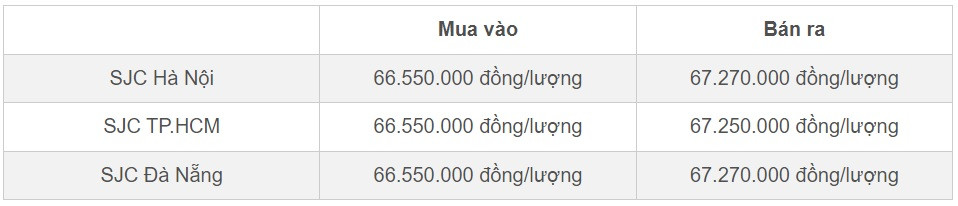 Doji Hà Nội niêm yết ở mức 66,6 triệu đồng/lượng (mua vào) và 67,35 triệu đồng/lượng (bán ra). Doji TP.HCM mua vàng SJC ở mức 66,6 triệu đồng/lượng, bán ra ở mức 67,2 triệu đồng/lượng.