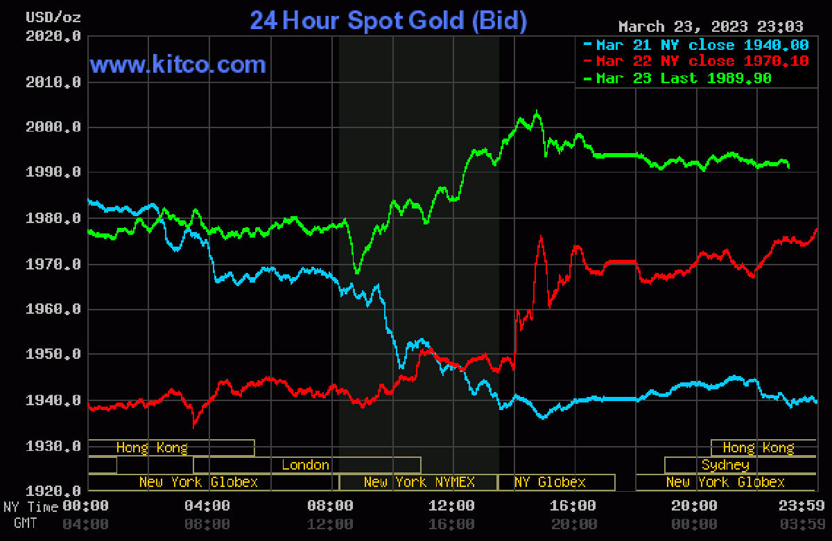 Trên thị trường vàng thế giới, giá vàng giao ngay 23/3 giao dịch ở mức 1.970 USD/ounce. Giá vàng kỳ hạn giao dịch ở mức 1.971 USD/ounce.