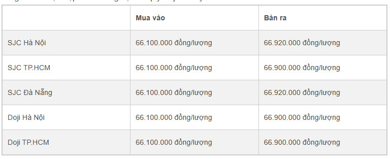 Doji Hà Nội niêm yết ở mức 66,2 triệu đồng/lượng (mua vào) và 66,95 triệu đồng/lượng (bán ra). Doji TP.HCM mua vàng SJC ở mức 66,15 triệu đồng/lượng, bán ra ở mức 66,95 triệu đồng/lượng.