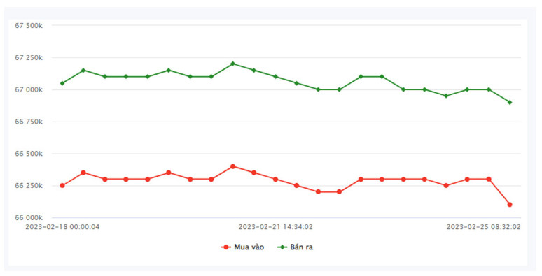 Chốt phiên giao dịch 24/2, giá vàng miếng 9999 tại SJC TP.HCM là 66,3 triệu đồng/lượng (mua vào) - 67 triệu đồng/lượng (bán ra). SJC Hà Nội niêm yết ở mức 66,3 triệu đồng/lượng (mua vào) và 67,02 triệu đồng/lượng (bán ra).