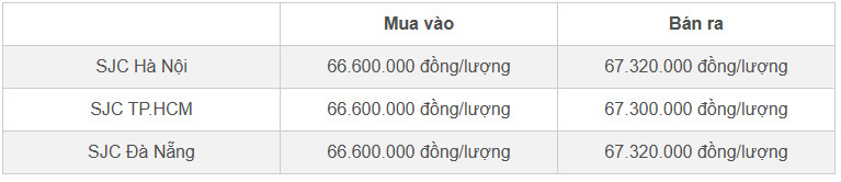 Doji Hà Nội niêm yết ở mức 66,55 triệu đồng/lượng (mua vào) và 67,25 triệu đồng/lượng (bán ra). Doji TP.HCM mua vàng SJC ở mức 66,65 triệu đồng/lượng, bán ra ở mức 67,25 triệu đồng/lượng.