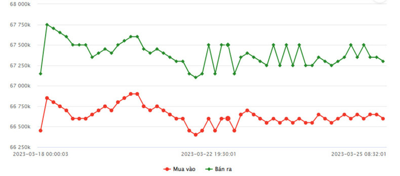 Chốt phiên giao dịch 24/3, giá vàng miếng 9999 tại SJC TP.HCM là 66,65 triệu đồng/lượng (mua vào) - 67,35 triệu đồng/lượng (bán ra). SJC Hà Nội niêm yết ở mức 66,65 triệu đồng/lượng (mua vào) và 67,37 triệu đồng/lượng (bán ra).
