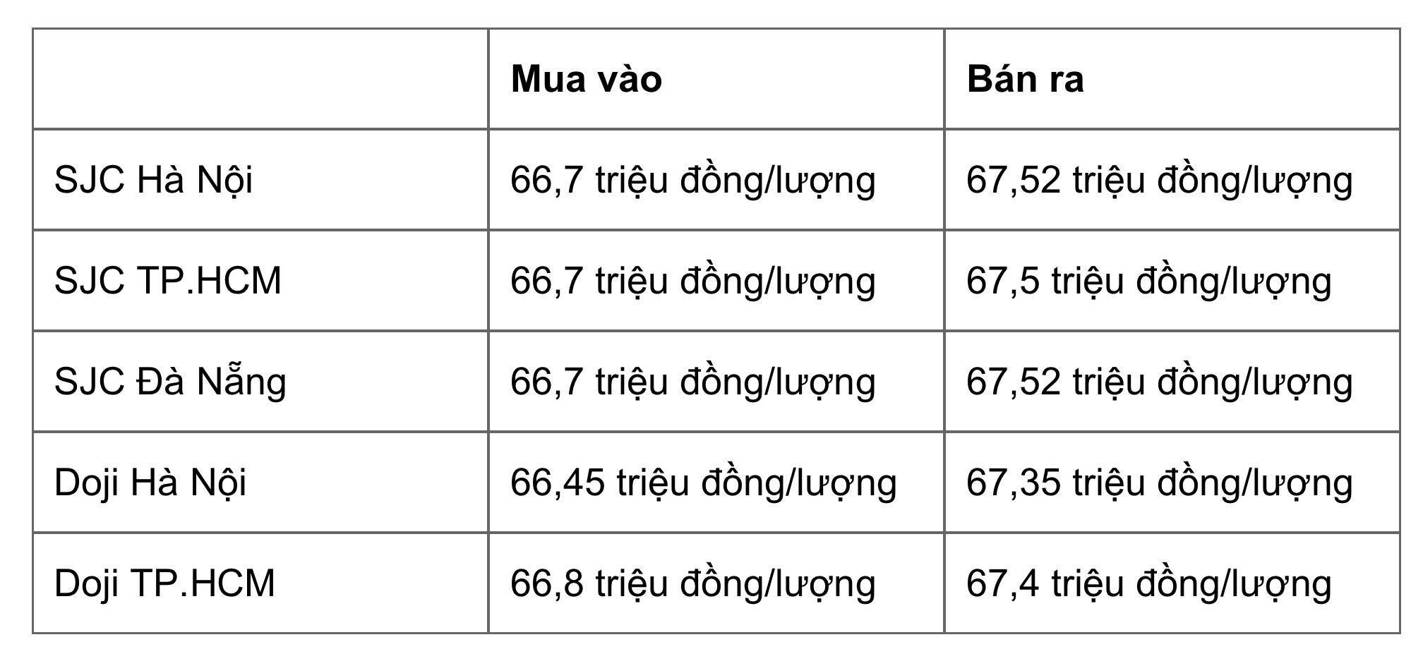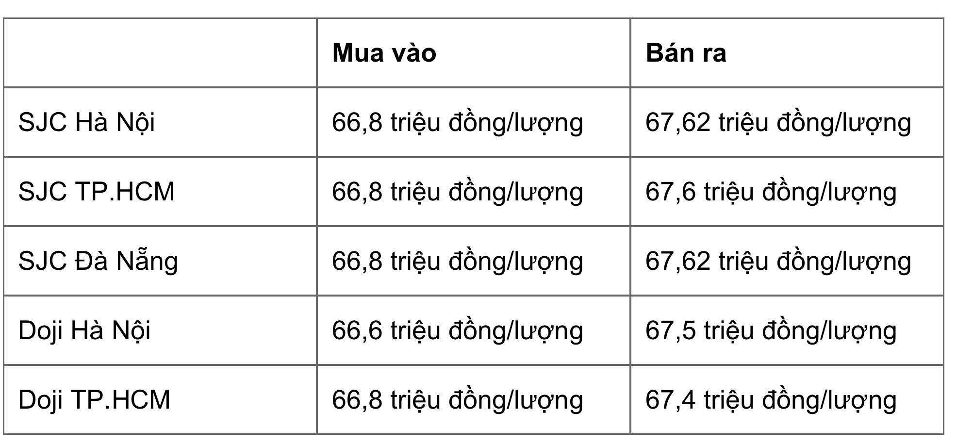 Doji Hà Nội niêm yết ở mức 66,7 triệu đồng/lượng (mua vào) và 67,65 triệu đồng/lượng (bán ra). Doji TP.HCM mua vàng SJC ở mức 66,8 triệu đồng/lượng, bán ra ở mức 67,7 triệu đồng/lượng.