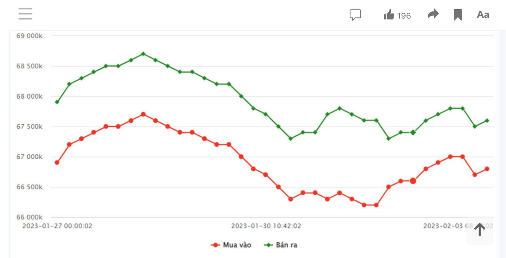 Kết phiên ngày 2/2, giá vàng miếng 9999 tại SJC TP.HCM là 67 triệu đồng/lượng (mua vào) - 67,8 triệu đồng/lượng (bán ra). SJC Hà Nội niêm yết ở mức 67 triệu đồng/lượng (mua vào) và 67,82 triệu đồng/lượng (bán ra).