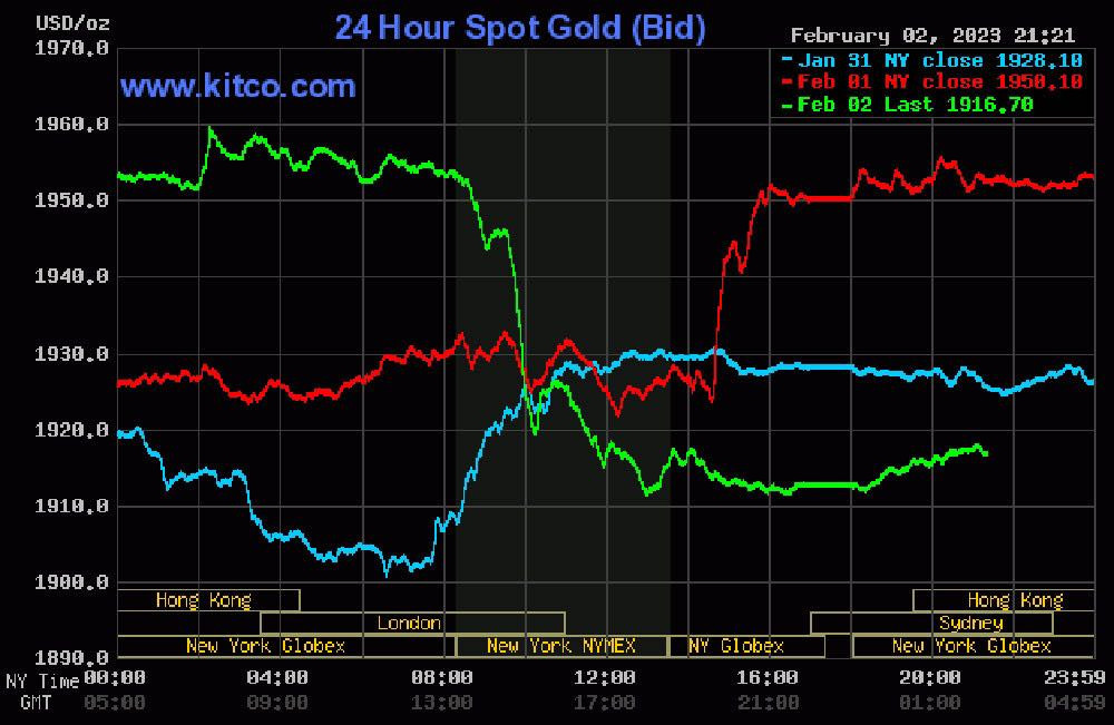 Tới 9h13' hôm nay (ngày 3/2, giờ Việt Nam), giá vàng thế giới giao ngay đứng quanh ngưỡng 1.916,4 USD/ounce, giảm 36,6 USD/ounce so với đêm qua. Giá vàng giao tương lai tháng 4 trên sàn Comex New York ở mức 1.931,6 USD/ounce, giảm 22,4 USD/ounce so với đêm qua.