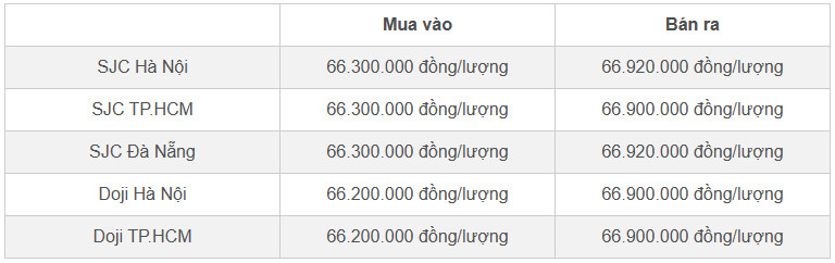 Doji Hà Nội niêm yết ở mức 66,2 triệu đồng/lượng (mua vào) và 66,9 triệu đồng/lượng (bán ra). Doji TP.HCM mua vàng SJC ở mức 66,4 triệu đồng/lượng, bán ra ở mức 67 triệu đồng/lượng.