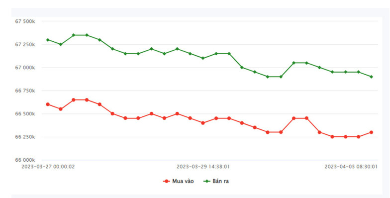 Chốt phiên giao dịch 1/4, giá vàng miếng 9999 tại SJC TP.HCM là 66,25 triệu đồng/lượng (mua vào) và 66,95 triệu đồng/lượng (bán ra). SJC Hà Nội niêm yết ở mức 66,25 triệu đồng/lượng (mua vào) và 66,97 triệu đồng/lượng (bán ra).