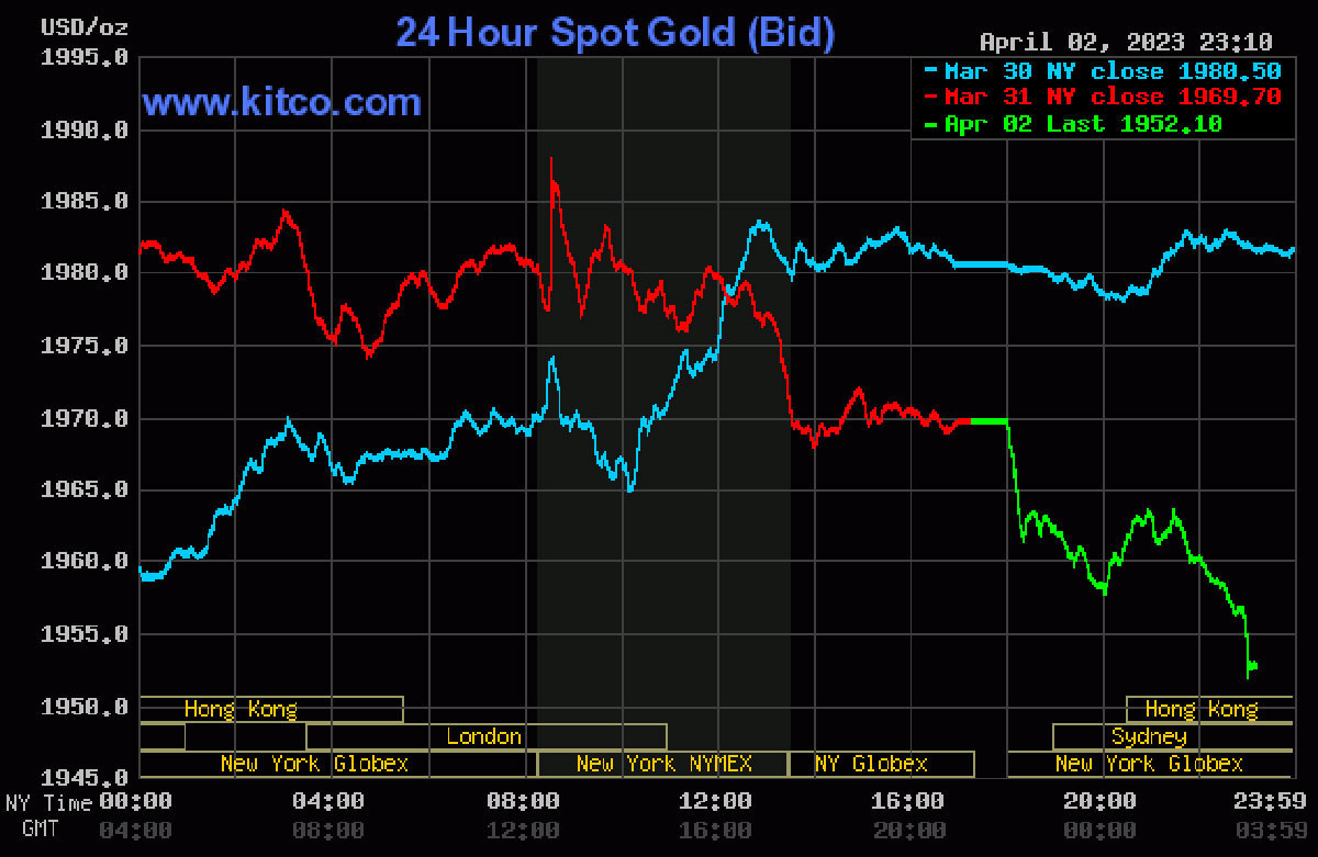 Tới 10h05' hôm nay (ngày 3/4, giờ Việt Nam), giá vàng thế giới giao ngay đứng quanh ngưỡng 1.953 USD/ounce, giảm 16 USD/ounce so với đêm qua. Giá vàng giao tương lai tháng 6 trên sàn Comex New York ở mức 1973,8 USD/ounce, tăng 3,8 USD/ounce so với đêm qua.