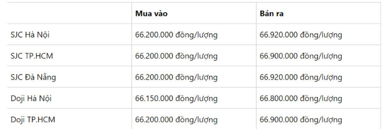 Doji Hà Nội niêm yết ở mức 66,15 triệu đồng/lượng (mua vào) và 66,8 triệu đồng/lượng (bán ra). Doji TP.HCM mua vàng SJC ở mức 66,1 triệu đồng/lượng, bán ra ở mức 66,8 triệu đồng/lượng.