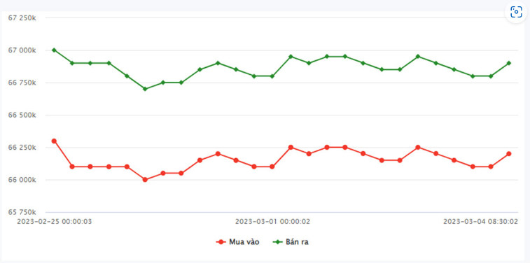 Chốt phiên giao dịch 3/3, giá vàng miếng 9999 tại SJC TP.HCM là 66,1 triệu đồng/lượng (mua vào) – 66,8 triệu đồng/lượng (bán ra). SJC Hà Nội niêm yết ở mức 66,1 triệu đồng/lượng (mua vào) và 66,82 triệu đồng/lượng (bán ra).