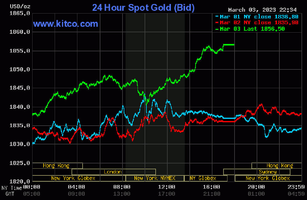 Tới 10h20' hôm nay (ngày 4/3, giờ Việt Nam), giá vàng thế giới giao ngay đứng quanh ngưỡng 1.856,5 USD/ounce, tăng 24,5 USD/ounce so với đêm qua. Giá vàng giao tương lai tháng 4 trên sàn Comex New York ở mức 1.854,6 USD/ounce, tăng 21,6 USD/ounce so với đêm qua.