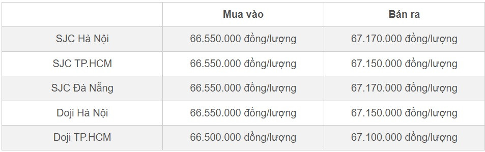 Doji Hà Nội niêm yết ở mức 66,3 triệu đồng/lượng (mua vào) và 67 triệu đồng/lượng (bán ra). Doji TP.HCM mua vàng SJC ở mức 66,25 triệu đồng/lượng, bán ra ở mức 66,95 triệu đồng/lượng.