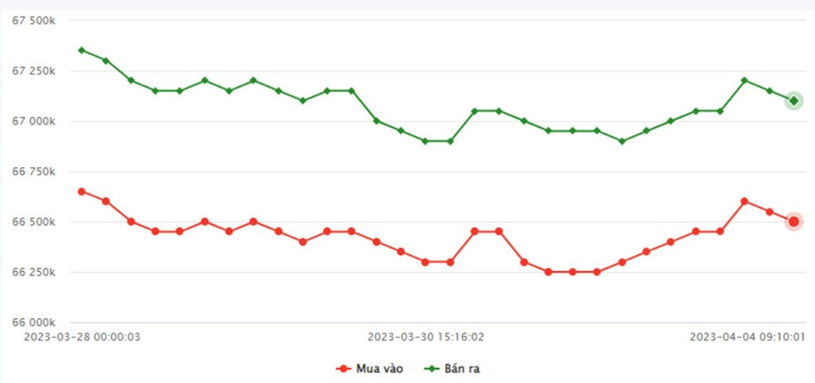 Chốt phiên giao dịch 3/4, giá vàng miếng 9999 tại SJC TP.HCM là 66,45 triệu đồng/lượng (mua vào) và 67,05 triệu đồng/lượng (bán ra). SJC Hà Nội niêm yết ở mức 66,45 triệu đồng/lượng (mua vào) và 67,07 triệu đồng/lượng (bán ra).