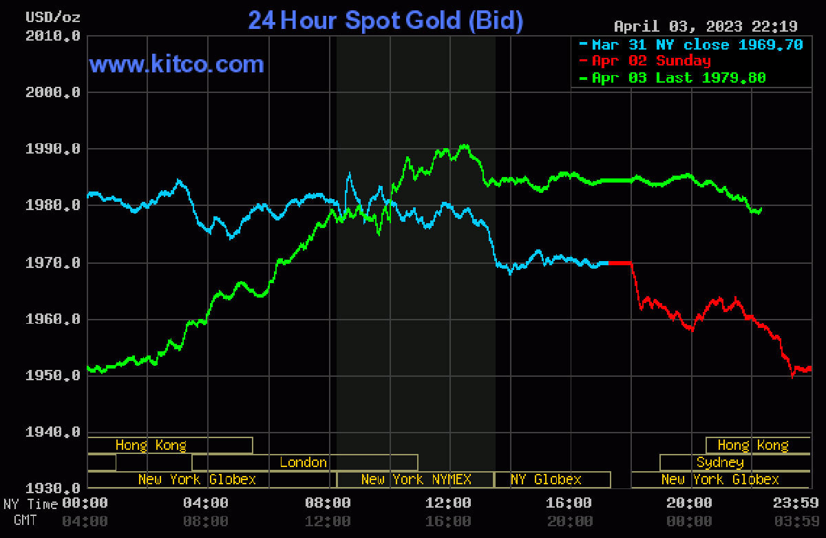 Tới 9h11' hôm nay (ngày 4/4, giờ Việt Nam), giá vàng thế giới giao ngay đứng quanh ngưỡng 1.978,5 USD/ounce, tăng 9,4 USD/ounce so với đêm qua. Giá vàng giao tương lai tháng 6 trên sàn Comex New York ở mức 1995,2 USD/ounce, tăng 9,1 USD/ounce so với đêm qua.