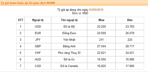 Sáng nay (4/9), Ngân hàng Nhà nước Việt Nam công bố tỷ giá trung tâm của Đồng Việt Nam với Đô la Mỹ, áp dụng cho ngày 04/09/2019 là: 1 USD = 23.146 VND.