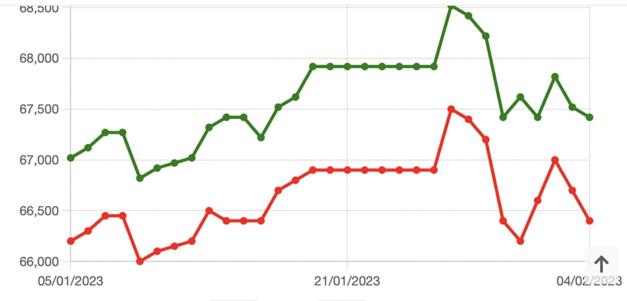 Chốt phiên giao dịch cuối tuần 4/2, giá vàng miếng 9999 tại SJC TP.HCM là 66,4 triệu đồng/lượng (mua vào) - 67,4 triệu đồng/lượng (bán ra). SJC Hà Nội niêm yết giá vàng ở mức 66,4 triệu đồng/lượng (mua vào) và 67,42 triệu đồng/lượng (bán ra).