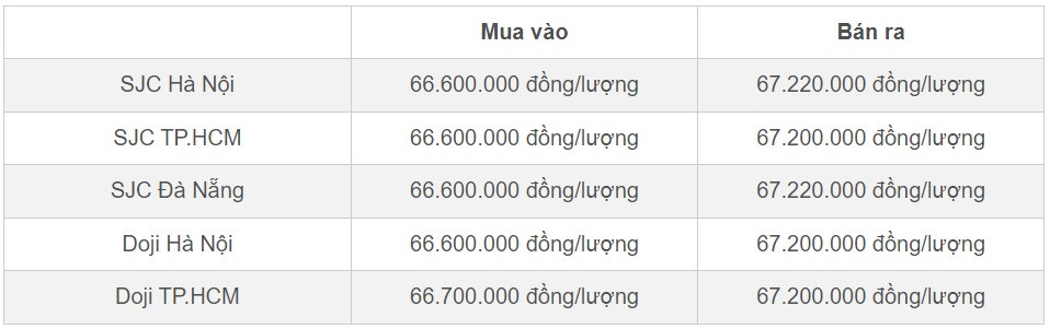 Doji Hà Nội: 66.400.000 đồng/lượng - 67.000.000 đồng/lượng