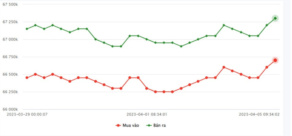 SJC Hà Nội: 66.450.000 đồng/lượng - 67.070.000 đồng/lượng