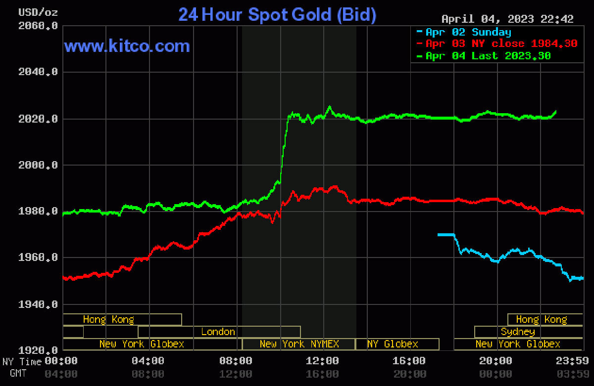 Đêm 4/4 (giờ Việt Nam), giá vàng thế giới giao ngay tăng vọt thêm 40 USD vào đầu giờ giao dịch trên thị trường Mỹ, lên ngưỡng 2.021 USD/ounce. Vàng giao tháng 6 trên sàn Comex New York ở mức 2.025 USD/ounce.