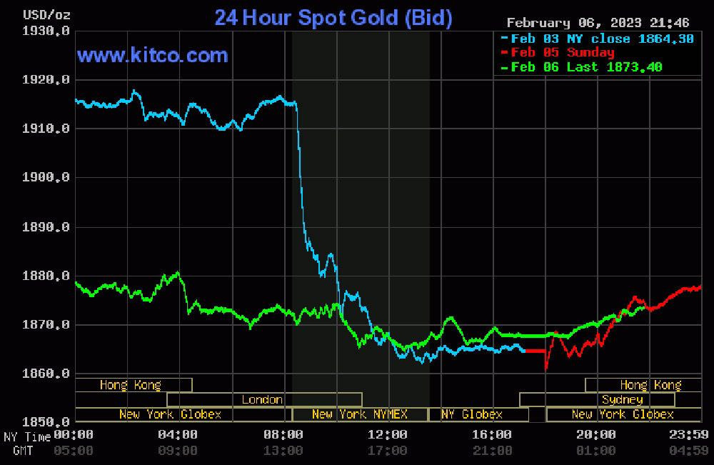 Tới 9h39' hôm nay (ngày 7/2, giờ Việt Nam), giá vàng thế giới giao ngay đứng quanh ngưỡng 1.873,5 USD/ounce, tăng 0,7 USD/ounce so với đêm qua. Giá vàng giao tương lai tháng 4 trên sàn Comex New York ở mức 1.885,8 USD/ounce, tăng 0,4 USD/ounce so với đêm qua.