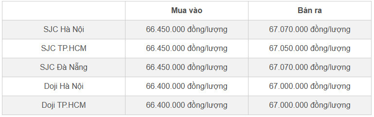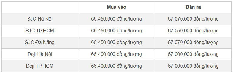 Doji Hà Nội niêm yết ở mức 66,4 triệu đồng/lượng (mua vào) và 67 triệu đồng/lượng (bán ra). Doji TP.HCM mua vàng SJC ở mức 66,5 triệu đồng/lượng, bán ra ở mức 67 triệu đồng/lượng.
