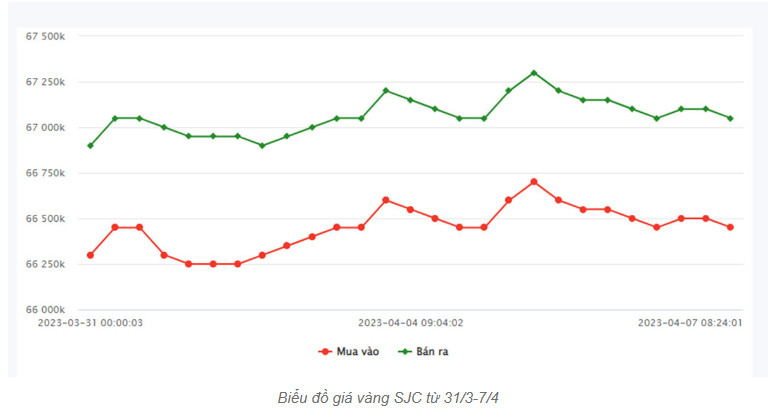 Chốt phiên giao dịch 6/4, giá vàng miếng 9999 tại SJC TP.HCM là 66,5 triệu đồng/lượng (mua vào) và 67,1 triệu đồng/lượng (bán ra). SJC Hà Nội niêm yết ở mức 66,5 triệu đồng/lượng (mua vào) và 67,12 triệu đồng/lượng (bán ra).