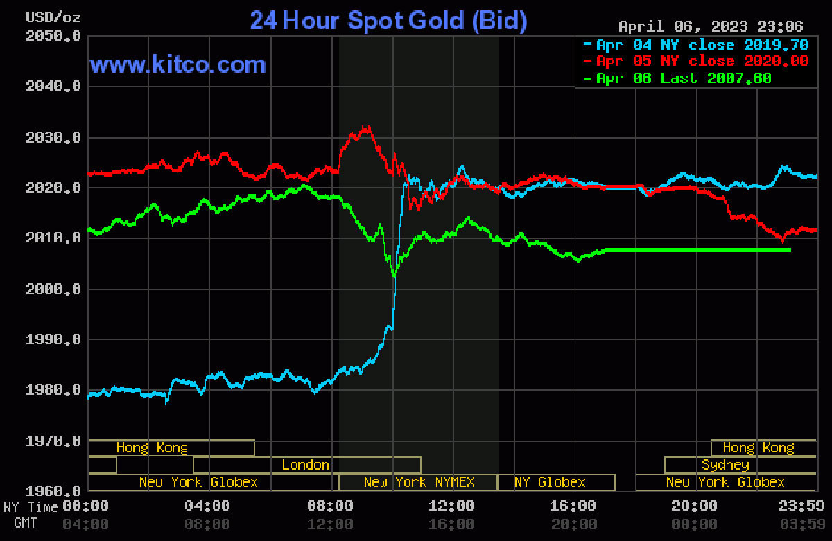 Tới 10h06' hôm nay (ngày 7/4, giờ Việt Nam), giá vàng thế giới giao ngay đứng quanh ngưỡng 2.007,6 USD/ounce, giảm 7,7 USD/ounce so với đêm qua. Giá vàng giao tương lai tháng 6 trên sàn Comex New York ở mức 2.026,4 USD/ounce, giảm 5,7 USD/ounce so với đêm qua.