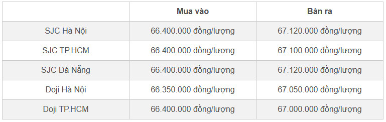 Doji Hà Nội niêm yết ở mức 66,4 triệu đồng/lượng (mua vào) và 67 triệu đồng/lượng (bán ra). Doji TP.HCM mua vàng SJC ở mức 66,4 triệu đồng/lượng, bán ra ở mức 67 triệu đồng/lượng.