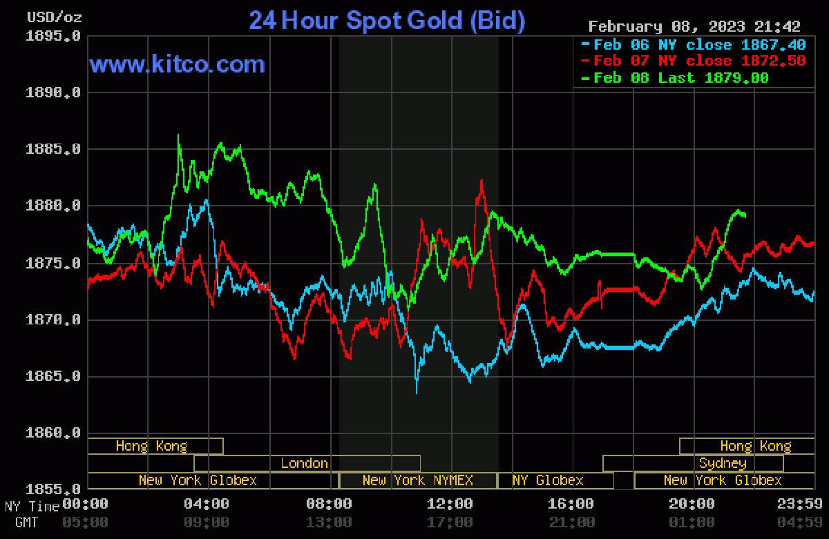 Đêm 8/2 (giờ Việt Nam), giá vàng thế giới giao ngay đứng quanh ngưỡng 1.875 USD/ounce. Vàng giao tháng 4 trên sàn Comex New York ở mức 1.986 USD/ounce.