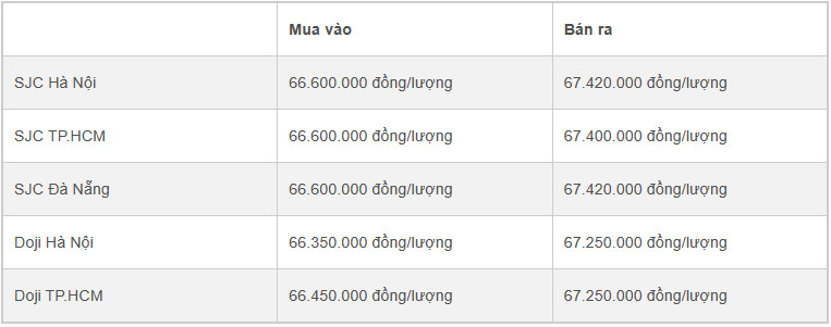 Đến chiều nay, giá vàng miếng của Doji tại Hà Nội giữ nguyên ở chiều mua vào và tăng 100 nghìn đồng/lượng ở chiều bán ra; giá vàng miếng của Doji tại TP.HCM tăng 50 nghìn đồng/lượng ở cả chiều mua vào và chiều bán ra so với buổi sáng.