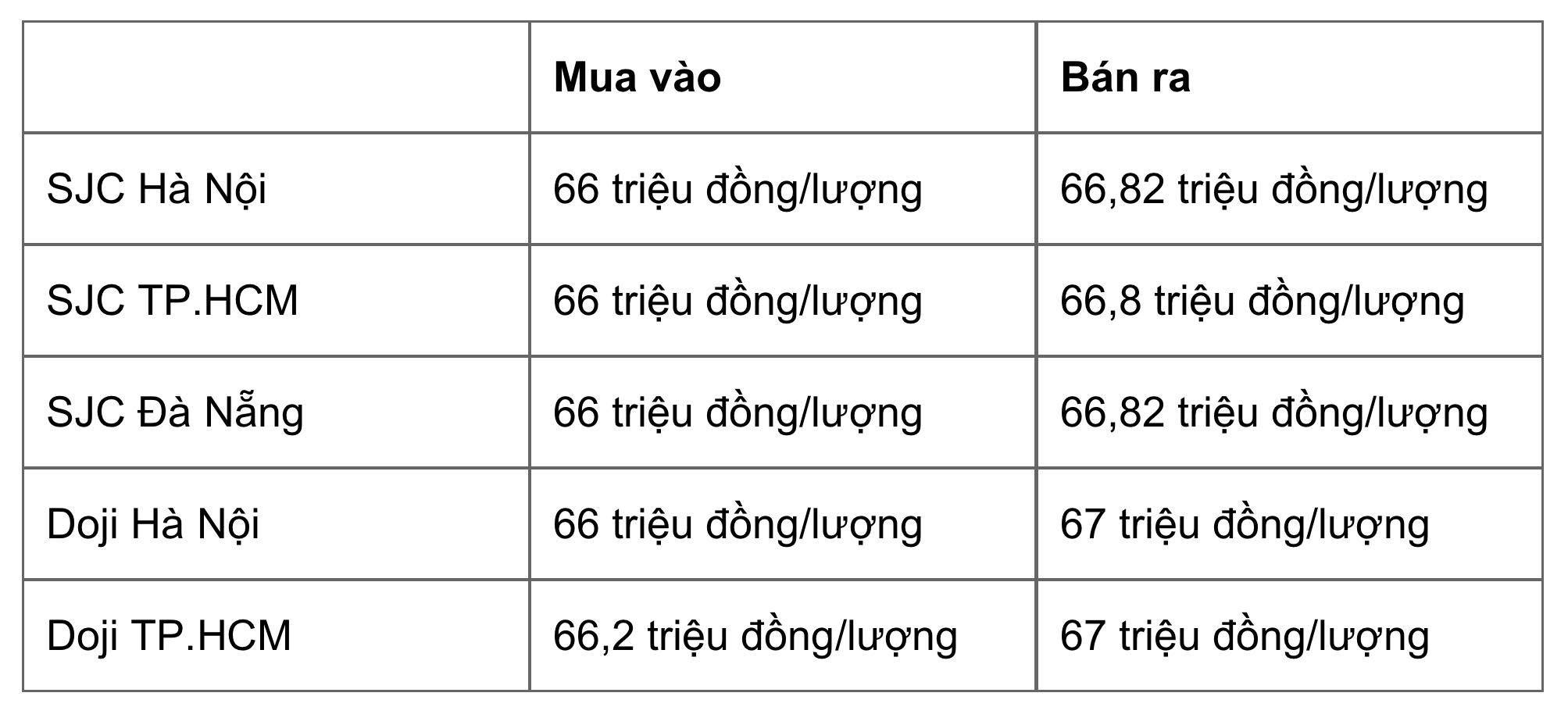 Đến đầu giờ chiều nay, giá vàng miếng của SJC quay đầu giảm 300 nghìn đồng/lượng so với buổi sáng. Cùng thời điểm, giá vàng miếng của Doji tại Hà Nội giảm 200 nghìn đồng/lượng còn giá vàng miếng của Doji tại TP.HCM giảm 100 nghìn đồng/lượng ở cả chiều mua vào và chiều bán ra so với đầu giờ sáng.