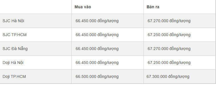 Đến chiều nay, giá vàng miếng của SJC giảm thêm 100 nghìn đồng/lượng so với buổi sáng. Còn giá vàng miếng của Doji tại Hà Nội giảm 100 nghìn đồng/lượng; giá vàng miếng của Doji tại TP.HCM không đổi so với buổi sáng.