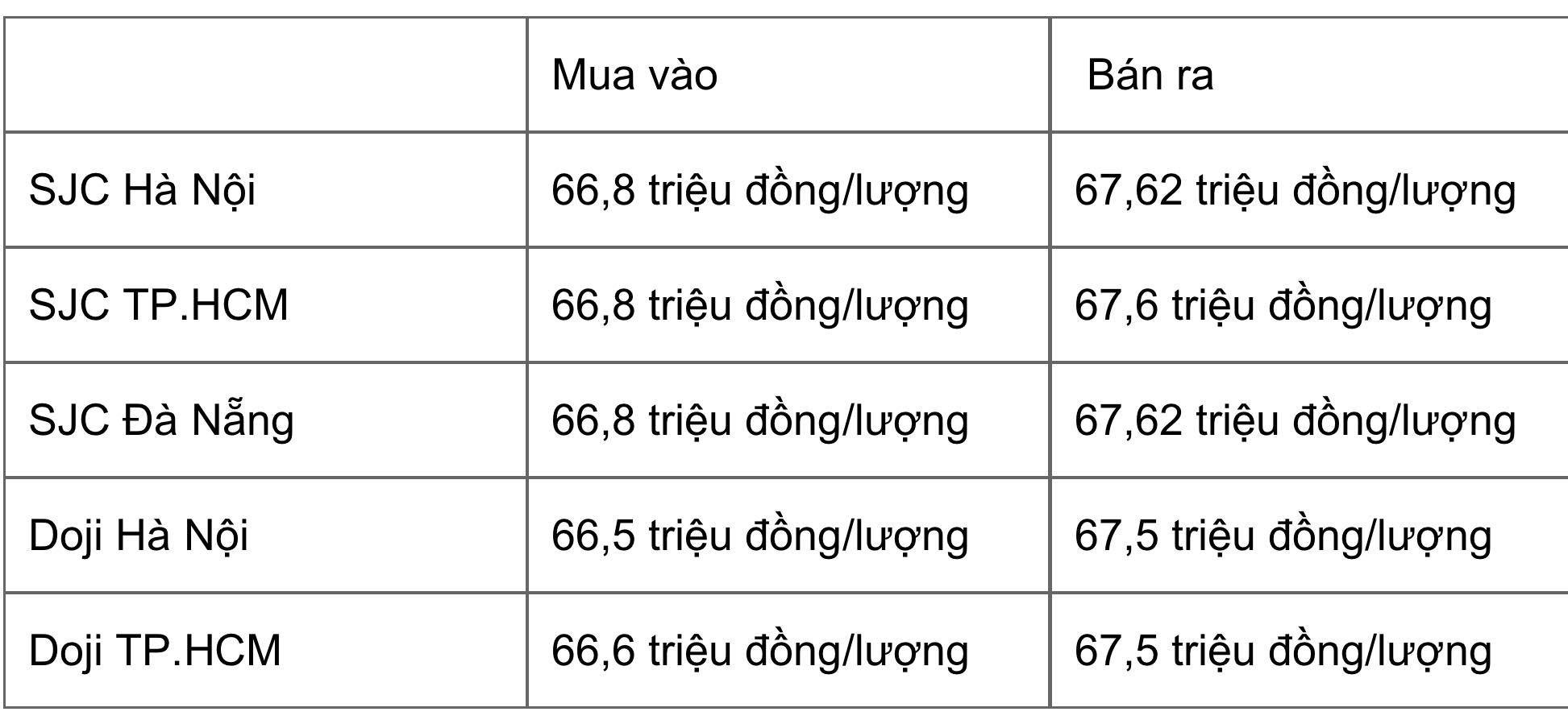 Chốt phiên hôm nay, giá vàng miếng của SJC tăng 100 nghìn đồng/lượng so với kết phiên hôm qua. Giá vàng miếng của Doji tại Hà Nội và tại TP.HCM cũng tăng 100 nghìn đồng/lượng so với hôm qua.