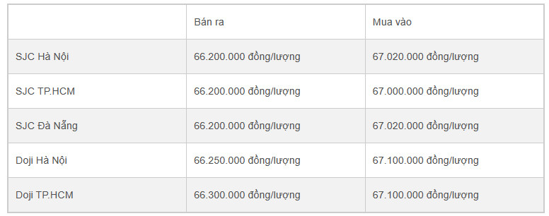 Tương tự, sáng nay, giá vàng miếng của Tập đoàn Vàng bạc đá quý Doji tại Hà Nội tăng 50 nghìn đồng/lượng ở cả 2 chiều; giá vàng miếng của Doji tại TP.HCM tăng 100 nghìn đồng/lượng ở chiều mua vào và giữ nguyên ở chiều bán ra so với chốt phiên giao dịch hôm qua.